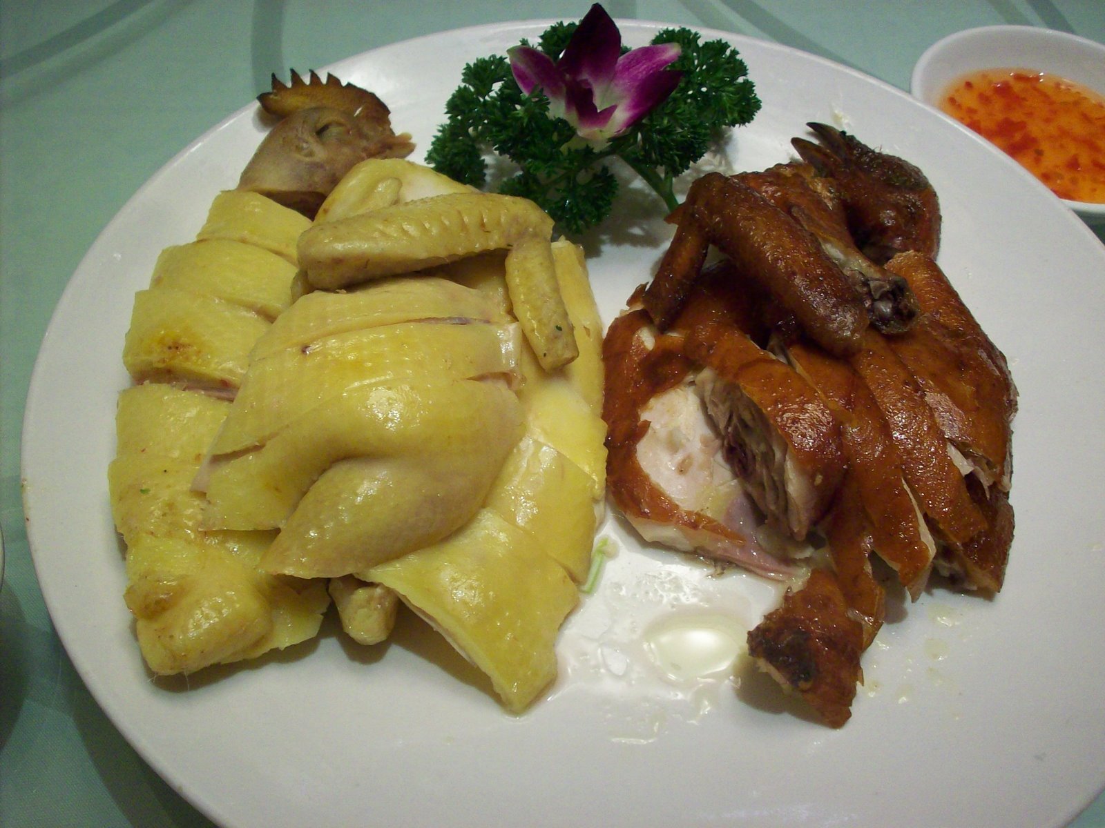 Two varieties of chicken: roasted on the right and — I don't know, boiled? Poached? — on the left.